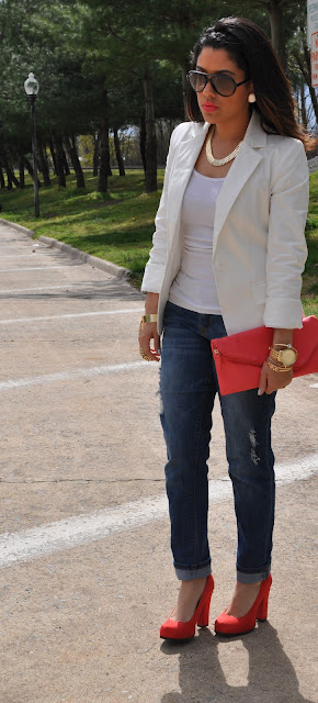 White blazers look super cute with pastels and neon shades, over a romper or jumpsuit, paired with shorts or a skirt, over a dress or just with a pair of jeans like I have on today. They will also go great with colored denim which will probably be how I wear it next. It's a great way to tone down printed patterns or bright colors too and bring the outfit together nicely. For my first time wearing a white blazer, I decided to go with white on white and a little pop of color. It's casual, chic and trendy.
